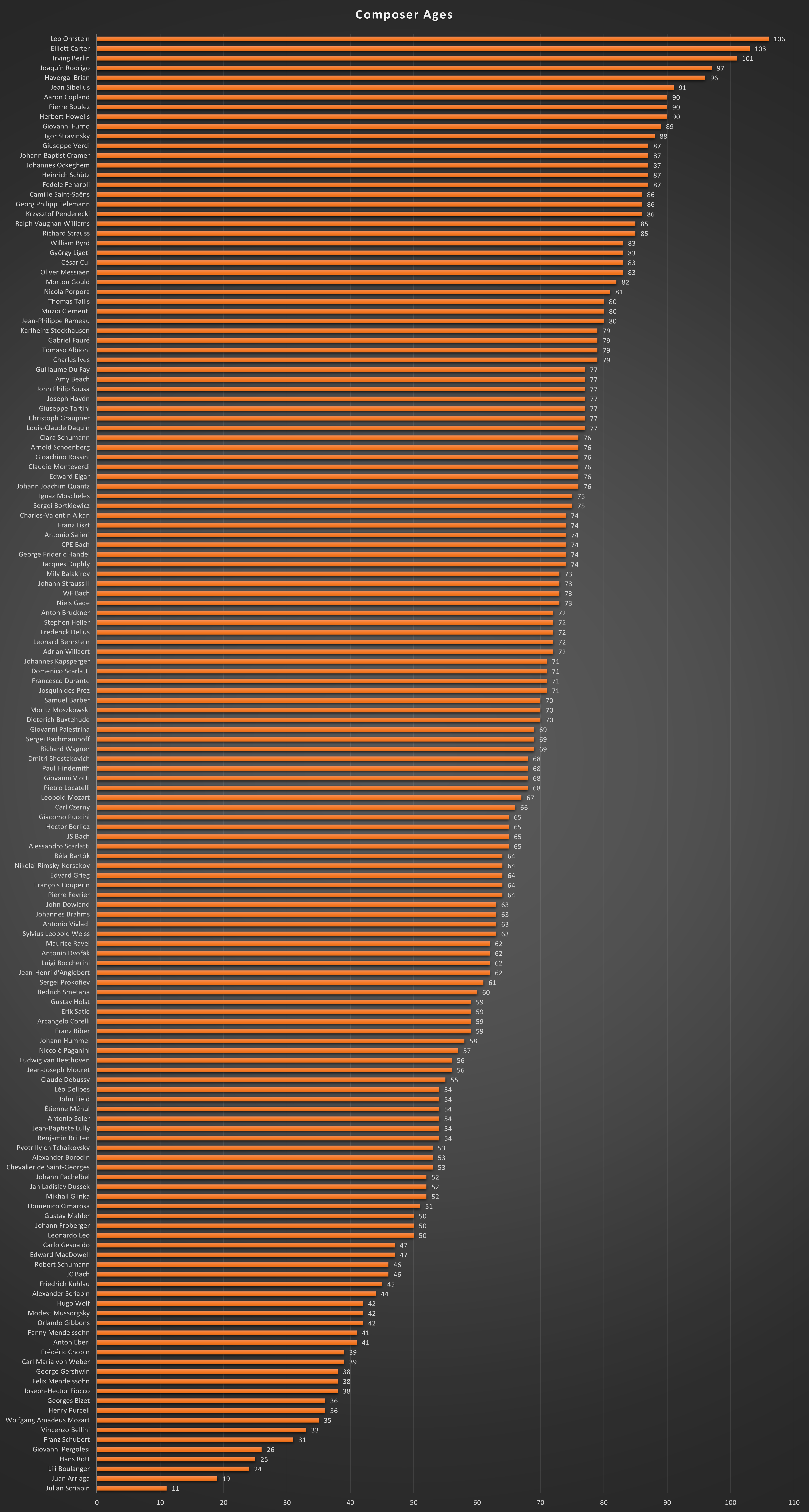 The top of this chart is dominated by more recent composers, as one would expect, but there are some surprisingly long-lived composers from earlier centuries as well, such as Giovanni Furno, J.B. Cramer, G.P. Telemann, William Byrd, Thomas Tallis, and Joseph Haydn.