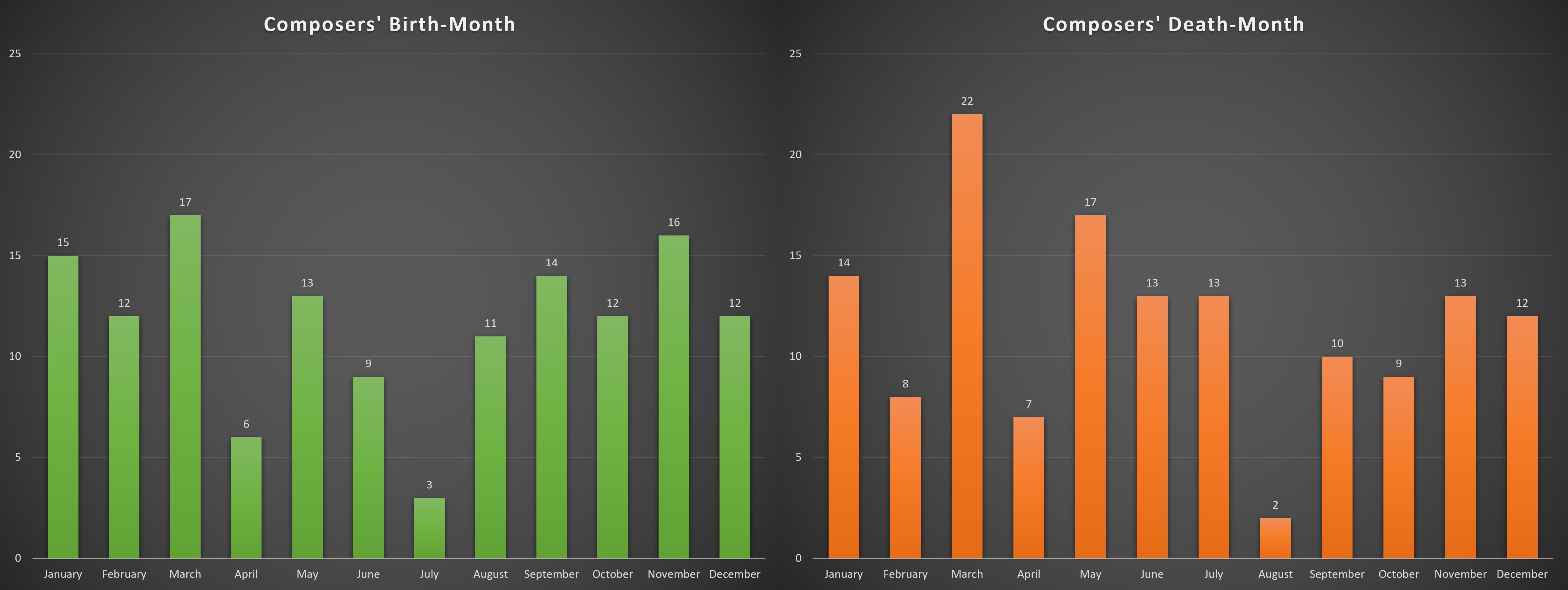 Even more surprising, March holds an even clearer lead over the 11 other months in composers’ death months as well.